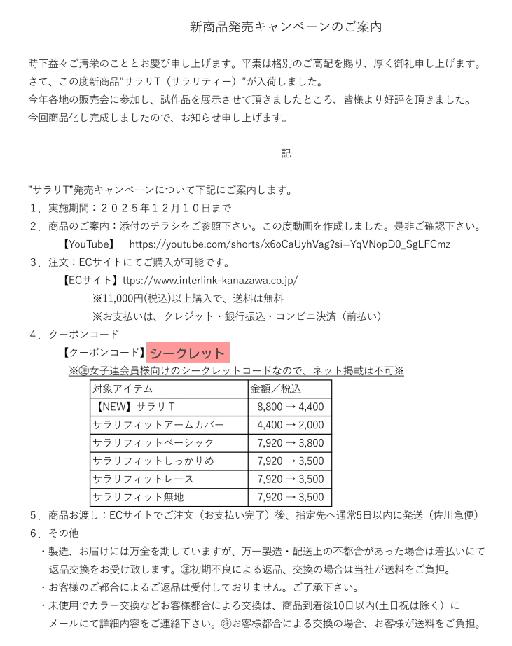 インターリンク金沢株式会社様より【日本女子テニス連盟会員限定】新商品「サラリT」発売キャンペーンのお知らせです。