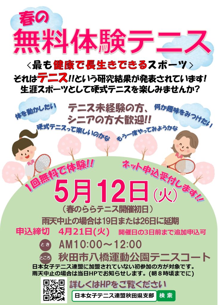 「ららテニス」へ初めて参加(以前も日本女子テニス連盟へ加盟されたことが無い)方は、1回無料でお試し体験できます。テニスに興味のある方、初めてテニスに挑戦される方、何度かテニスをしたことが有る方、久しぶりの方、お引っ越しされてきてテニス仲間をさがしている方、子育て中のママさん、シニアの女性の皆さん、、、、どなたも大歓迎!!お待ちしています!