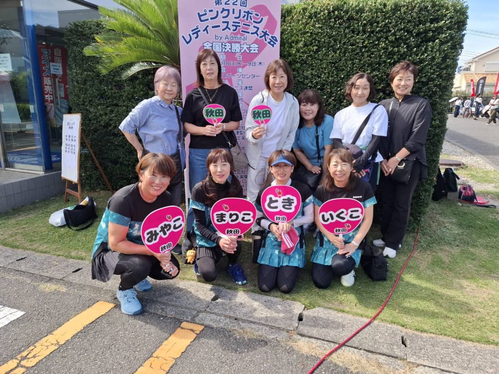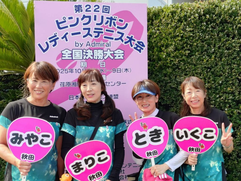 初めてのハードコートのピンクリボンは、前日練習はしたものの、対応が難しかった。55歳以上ペア二人のナイスゲームでの勝利!なんとか続きたいと挑んだ試合でしたが、自分たちらしいプレーをさせてもらえず、厳しい展開でした。大曲から来てくれた応援団に少しでも応えたいと思いましたが叶わず…でも、キャプテン、応援団の声援は心強かったです。課題山積みですが、また練習に励みます。コーチ、練習仲間、秋田からも応援してくださった方々には感謝の気持ちでいっぱいです。ありがとうございました。
