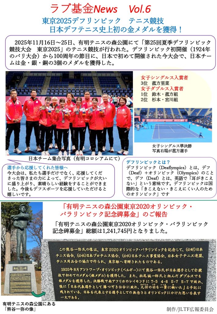 また有明テニスの森公園記念碑設置募金へは5,713円を2025年6月に送金しております。温かいご協力ありがとうございました。今年度もどうぞよろしくお願いいたします。