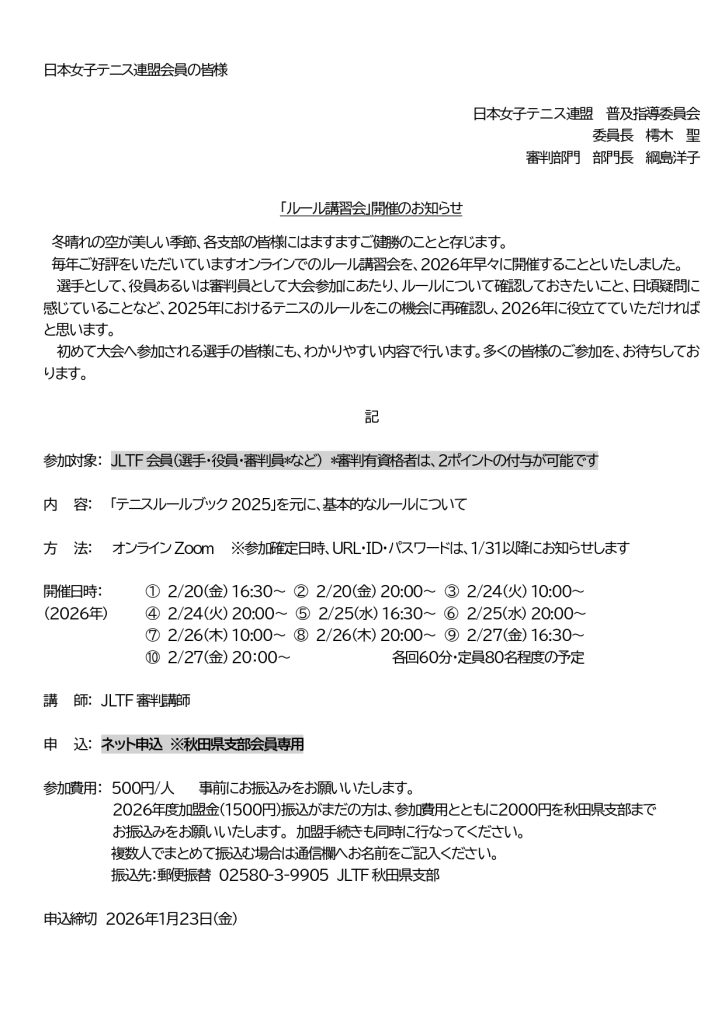 2026年2月、JLTF会員の皆さんを対象としたルール講習会をオンライン(ZOOM)で開催します。審判員資格をお持ちでない方もご参加可能です。ぜひこの機会に、日頃疑問に思っていること等ルールの再確認を行ないましょう!初めて大会へ参加される選手の皆さんにもわかりやすい内容で行ないます。多くの皆さんのご参加をお待ちしております。